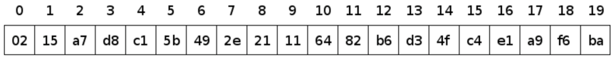 前面的图中包含40个字符,每个字符都占4-bits(有16个可能的值0-15),被分成了20组单独的字符串。
